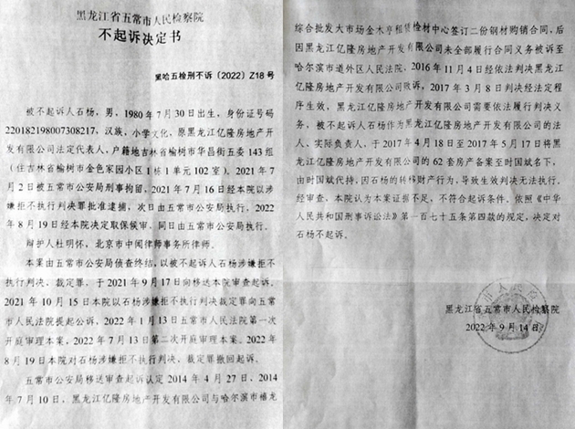 我是石杨,身份证号码:220182198007308217,是黑龙江省亿隆房地产开发有限公司(以下简称亿隆公司)的实际控制人。十一年前的2011年,我从吉林省榆树市,经刘晏介绍来到哈尔滨市下辖的五常市搞棚户区改造房地产开发,当时我是带着8000万元投资来的,却遭遇了地狱般的投资环境:五常市当地城管局副局长张成,李秀杰,于洪伟等一些人官商勾结,巧取豪夺,将我亿隆公司的财产占为己有,同时又编造冤假错案,将我关进大牢,至今我已经被五常的黑恶势力搞得倾家荡产。直到2022年9月14日,五常市检察院作出黑哈五检刑不诉【2022】Z18号不起诉决定书后,我才得以走出大牢,重见天日。今天,我要实名控诉张成,李秀杰,于洪伟一伙人的滔天罪恶,为了改善投资营商环境,希望上级纪委、监察和政法部门能早日还我一个公道。