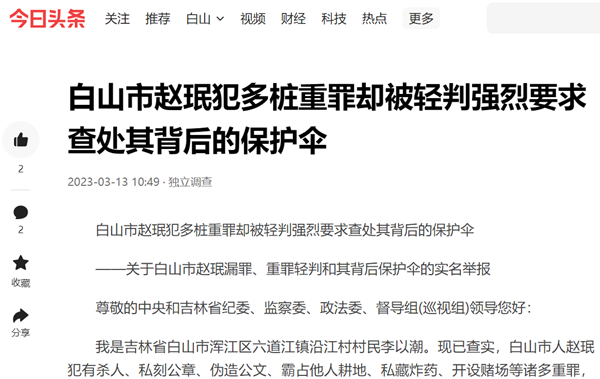 我叫李以潮,家住吉林省白山市浑江区六道江镇江沿村,我实名举报吕健(白山市中级人民法院常务院长、赵珉亲姐夫)充当黑恶势力赵珉的背后保护伞,致使赵珉在白山市横行三十多年无人敢动。在我不断举报和媒体的压力下,靖宇县法院不得不对其判刑,却重罪轻判,至今也不给我任何赔偿,而其背后的保护伞至今仍逍遥法外。