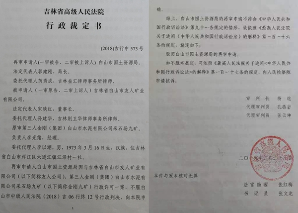 三、我与赵珉因其伪造虚假采矿手续而打官司,此官司从2017年12月一直打到2020年7月1号。这起官司中,在吕健精心安排下,赵珉虽然伪造假手续却能在三级法院连胜。赵珉在办理友人矿业手续时,向白山市浑江区国土资源局所提交的北方水泥金刚(集团)白山水泥有限公司的文件及公章均属伪造,又向浑江区国土资源局提交了白山市安全生产监督管理局( 2015--1号文件及公章)系为伪造。金刚(集团)白山水泥有限公司采石场九矿(以下简称:金刚九矿)是经政府挂牌、招牌挂所取得的,价款是一次性付清给财政的。在2017年12月份,赵珉以坐标点重叠为由,把白山市国土资源局和我金刚九矿起诉到白山市浑江区法院,2018年2月20日,法院判赵珉假手续胜诉。胜诉后,赵珉乘胜又向白山市中级法院上诉,要求撤销我金刚九矿招牌挂合法手续。2018年6月12日,白山市中级法院又一次完成了赵珉的心愿,撤销了我金刚九矿的合法手续,我金刚九矿和白山市国土资源局不服白山市中级法院判决,特向吉林省高级人民法院提起申诉。2019年2月,吉林省高级人民法院再次判决赵珉假手续胜诉,三级法院居然保护了造假人的权益,不难看出赵珉背后保护伞的强大。