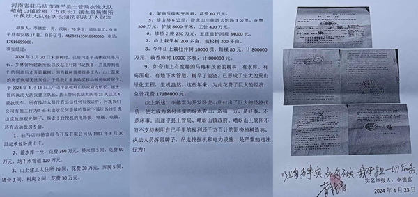 综上所述,李德富为开发卧虎山庄付出了巨大的经济代价,使之成为名付其实的绿水青山,造福一方,是好事,不是坏事。而遂平县土管局、嵖岈山镇政府、嵖岈山土管所不但不支持,反而利用自己手里的权力千方百计的阻挠植树造林,执法人员拆毁牌子,吊走挖掘机和电力设施,是严重的违法行为!