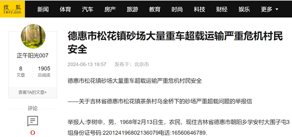 ——关于吉林省德惠市松花江镇茶条村乌金桥下的砂场严重超载问题的举报信