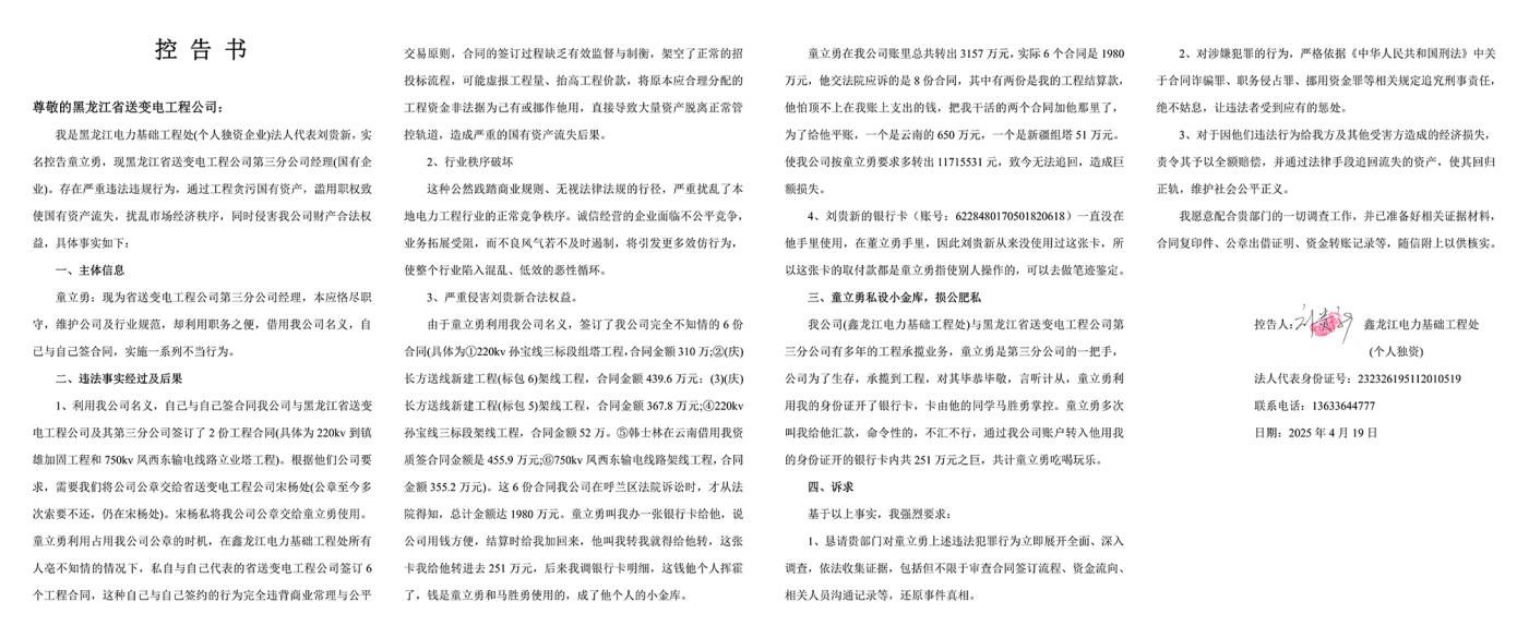 在忍无可忍的情况下,刘贵新,黑龙江电力基础工程处(个人独资企业)法人代表,实名控告童立勇,现黑龙江省送变电工程公司第三分公司经理(国有企业)。童立勇存在严重违法违规行为,通过工程贪污国有资产,滥用职权致使国有资产流失,扰乱市场经济秩序,同时侵害控告人刘贵新公司财产合法权益,具体事实如下: