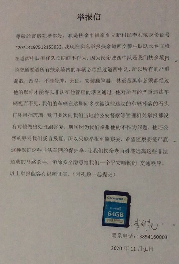 作为问题,他还公然的辱骂我们扬言要报复。所以,我们只能举报到监察委,希望监察委能严查这种保护非法车辆的保护伞,让我们扶余老百姓能远离这些非法超载的马路杀手,消除安全隐患,给我们一个平安顺畅的交通秩序。