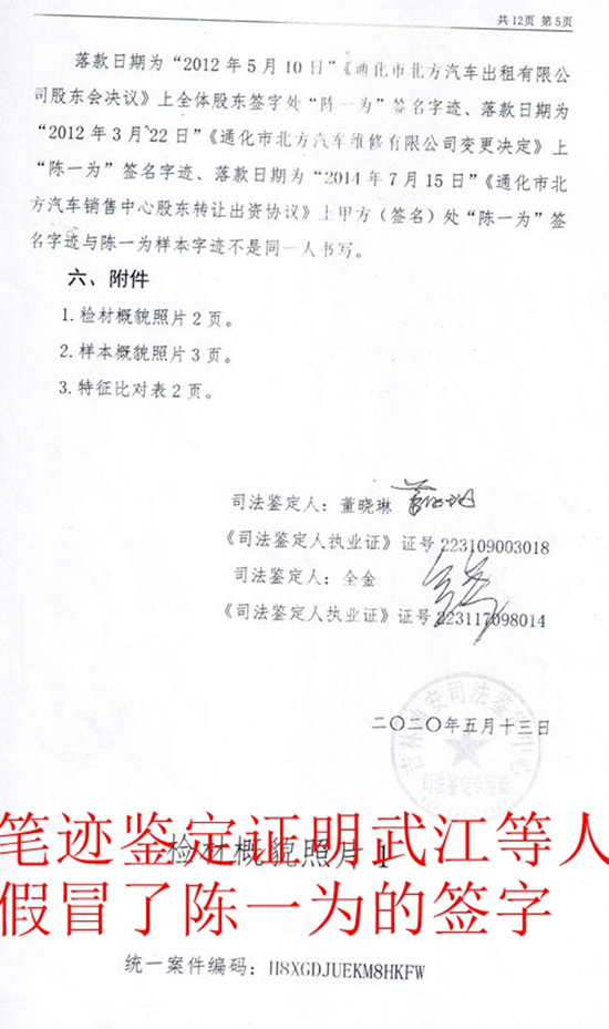 附主要证据:1、省委巡视组交接单;2、吉林迪安司法鉴定中心字迹鉴定结论(证明股权及法定代表人变更非陈一为字迹);3、武江出具的证明材料(证明陈一为不知情);4、张建华出具的证明材料(证明陈秀忠安排其伪造签字更改股权法定代表人);5、崔连杰证明材料(证明陈秀忠承认更改股权法定代表人);6、张永华证明材料(证明陈秀忠承认同意恢复更改的股权、法定代表人,并敲诈80万元的事实);7、通化市公安局刑事复核决定书。