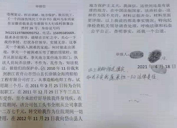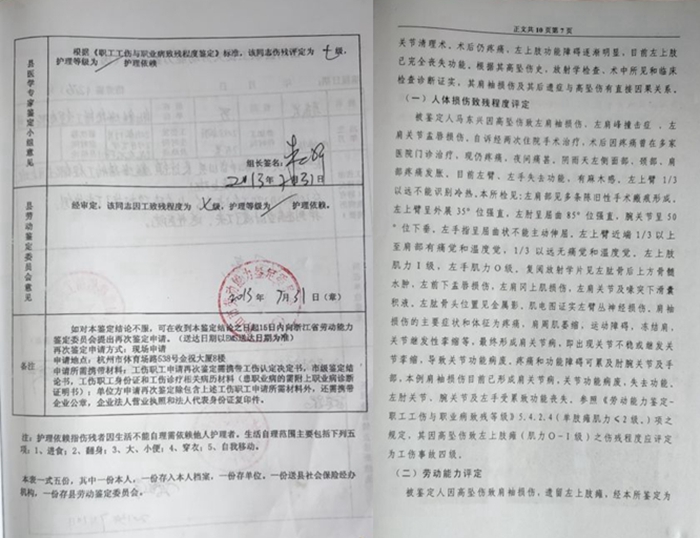 仲裁员於国君在制作的调解书中写了荒谬的一句话——要求“被申请人支付被申请人”,双方解除劳动关系,无其他争议。岱山县人民法院法官看到这句话,更改了我的劳动仲裁调解书。在2016年9月,岱山县人民法院给我邮寄的领款通知书显示,我作为一名因工导致的四级伤残残疾人,最终所获的补偿仅有254元!