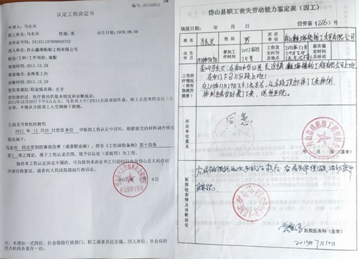 在2010年11月份,我来到浙江省舟山市岱山县长途镇金海湾船舶工程有限公司打工,从事造船电焊工作,试用期三个月,在2011年2月25日转为合同制职工,在2011年12月29日下午三点左右因工受伤,至今未治愈导致终身残疾。