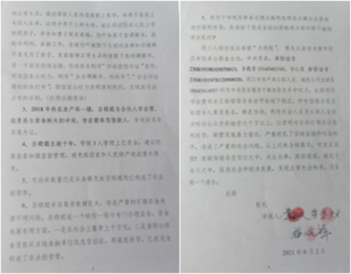7、领导干部利用职务之便以高利息吸收大额公众资金进行高利放贷,是谁给了他在全国扫黑除恶大好形势下继续违法乱纪的胆量?现三人联合实名举报同江市住房公积金主任吕晓聪,中共党员,身份证号:230819198103070013,手机号:15145485345;李宏霞,身份证号:230819197812090020,同江市房产局公职人员,城投公司出纳员,手机号:18645414957,其利用党员领导干部身份及手中权力,长期利用李宏霞母亲王丽荣顶名非法开设地下钱庄,所有借据没有王丽荣本人真实签名,都是伪造。吕晓聪、李宏霞利用社会人员及公职人员非法吸收公众存款融资达千万以上,以营利为目的巨额非法高利放贷,频繁实施暴力催收,严重扰乱了当地金融和社会秩序,造成了严重的社会问题。