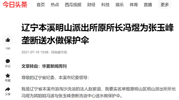 我是辽宁省本溪市浪淘沙洗浴的法人赵紫涵,我要实名举报原明山区明山派出所所长冯煜为其姐姐冯波与张玉峰垄断洗浴中心送水做保护伞。