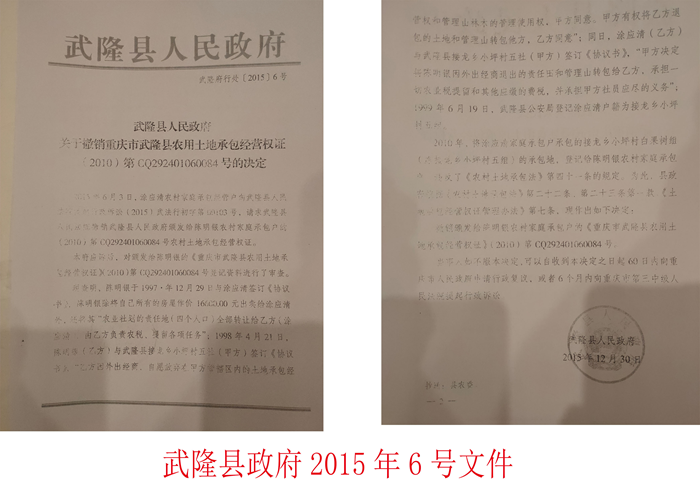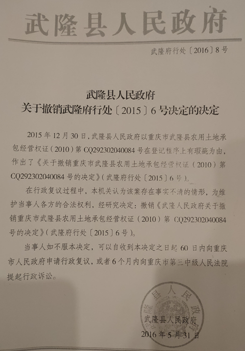 (2015)6号文件撤销重庆市武隆县农用土地承包经营权证(2010)第CQ292401060084号决定,已被武隆县人民政府(2016)8号文件撤销了。