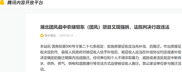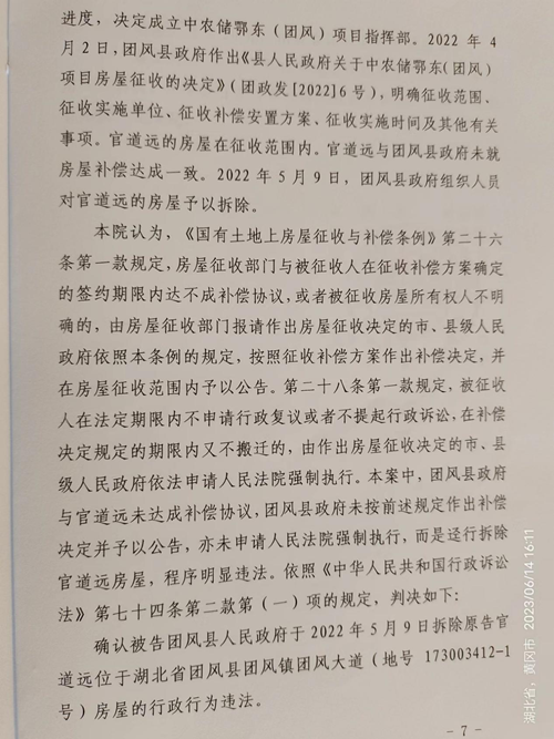 湖北省黄冈市中级人民法院(2022)鄂11行初52号判决书判决:确认团风县人民政府拆除团风大道东侧房屋的行政行为违法;湖北省高级人民法院(2022)鄂行终1150号判决:确认团风县人民政府2022年4月2日作出的《县人民政府关于中农储鄂东(团风)项目房屋征收的决定》(团政发{2022}6号)违法。