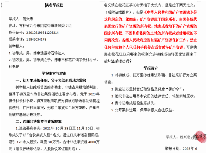 本站讯 近日,吉林省九台市团结街道新风委7组居民魏兴忠再次向相关部门及媒体实名举报德惠远游砂石场法人初维成及其子、德惠市松花江镇茶条村村长兼村书记初万里,指控其存在...