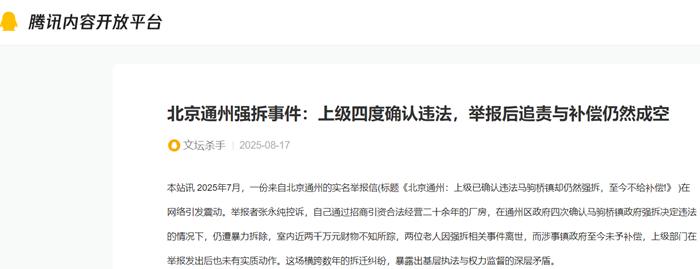 北京通州强拆事件:上级四度确认违法,举报后追责与补偿仍然成空