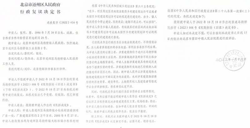 -——2023年6月,镇政府新作出的限期拆除回填决定书及强制拆除决定书,再次被通州区政府确认违法;