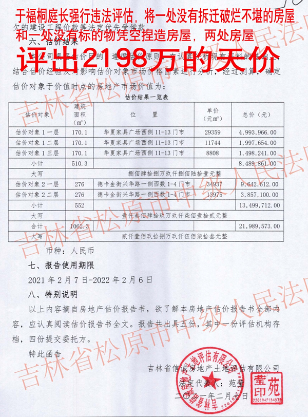 更令人震惊的是评估环节。据德卡公司提供的证据显示,银行原址其中一处华夏棚户区2007年至今已经18年扶余住建局没有拆迁完,导致银行起诉。现房产已"破败不堪、无商业价值",另一处因政府拓宽道路被占没。但于福桐庭长单方委托的评估公司却给出了"天价结论":华夏棚户区门市一层单价达29359元/平方米,在没有标的物的情况下竟凭空评出一层单价34937元/平方米,两处房产评估总价高达2198万余元,远超同地段新建商铺均价。