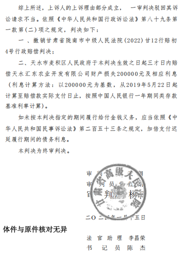 2020年10月9日,陇南市中级法院作出判决,确认被告麦积区政府行政强制移栽汇东公司树苗的行政强制行为违法。