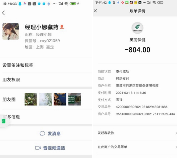 我是李先生(手机号137××××1984),在今年(2021年)3月份,从21保健品网(网址:https://www.bjspw.com/)上联系帮朋友购买藏御逍遥丸,先买一小盒,朋友试用以后感觉不错,我就又通过快递得到的李女士的电话(手机号:13799371673)联系再次购买并加了她的微信(微信名:经理小娜,微信号:CXY0210059)。因为前次购买的产品不错,这次就想多买。之后,李女士让我通过付款码先付款。因为前次正常收到货了,这次就很信任。我没有多想,就按照李女士的要求向鹰潭市月湖区英丽保健服务部付款804元(网上标注的价格是894元,李女士说给予优惠,按804元收取),订购了一大盒藏御逍遥丸。