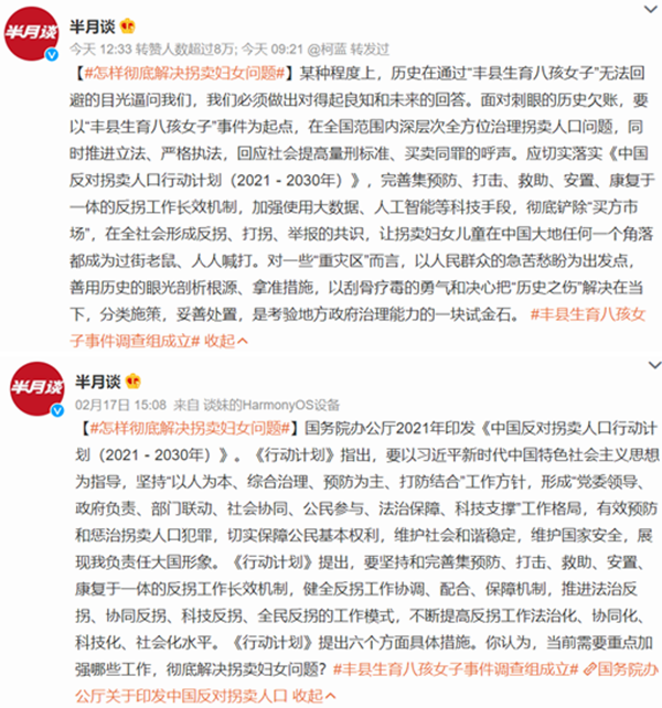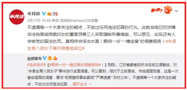 18日,《半月谈》杂志刊发配图文章《怎么彻底解决拐卖妇女问题?》说:某种程度上,历史在通过“丰县生育八孩女子”无法回避的目光逼问我们,我们必须做出对得起良知和未来的回答。面对刺眼的历史欠账,要以“丰县生育八孩女子”事件为起点,在全国范围内深层次全方位治理拐卖人口问题,同时推进立法、严格执法,回应社会提高量刑标准、买卖同罪的呼声。