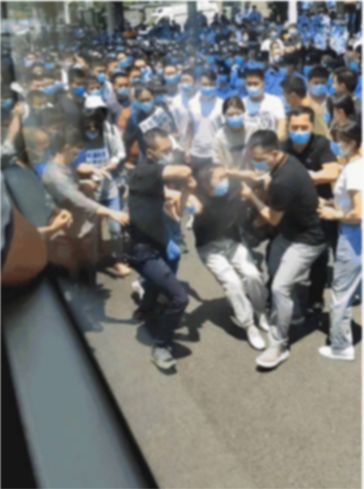 可就在昨天上午,郑州市便突破了法西斯底线,无数身着统一服装(身着统一服装的目的是避免在大规模围殴中误伤自己人)的彪形大汉将数千名前来银行取钱的储户围起来殴打,现场视频中显示有七八个彪形大汉将一个瘦弱男子架起来殴打。而这些储户被打的原因就是因为他们想从银行里取出他们所存的血汗钱。或许他们家里正在等着这笔钱买米下锅,或许他们在医院里垂危的亲人正在等着这笔钱救命!但无论他们想用这笔钱做什么,都不应该被人往死里打。
