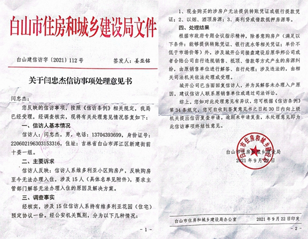 2021年9月22日,白山市住建局针对闫忠杰代表15户购房户的上访,做出了“关于闫忠杰信访事项处理意见书”(白山建信访字[2021]112号)。该意见书称:“经核实,涉及15位信访人系持有维多利亚花园(住宅)预定协议一份。经公安机关甄别,分为以下几种情况:1、现金购买的涉房户无法提供转账凭证或银行提款凭证;2、以烟、酒顶房源;3、高利贷或借款抵押房源等。”“处理结果:根据市政府专题会议指示精神,除善意购房户(满足以下条件:能够提供转账凭证、银行流水等相关凭证;单价不低于市场价等)外,涉及城开公司接盘建设后原华邦公司或者合陆公司自行违规销售、抵顶、借款等方式产生的房源纠纷,由原销售单位进行解答、自行处理;涉及违法的,由相关司法机关依法处理或受理。城开公司已当面回复信访人,并为其解答未办理入户原因,建议信访人联系原销售单位或通过司法诉讼。”