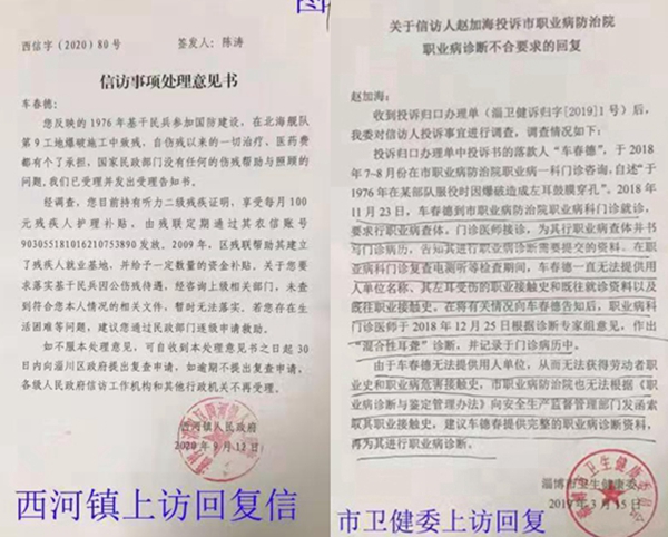 车春德说:他在上访期间,曾向北京一位资深律师咨询,律师看了他的伤残材料后,给他指点说:“当时你是原张庄人民公社输出的基干民兵,原张庄人民公社已合并到现在的西河镇人民政府,因他们是基干民兵输出的单位,伤残赔偿就应该由现在的西河镇政府来全方位承担!其一:双耳二级伤残,可以去市级以上职业病防治院鉴定职业病,只要是职业病,西河镇政府应该无条件给予办理养老和医疗保险,并赔偿四十多年来的伤残、医疗、医药、陪护等相关费用。其二:倘若职业病医院鉴定为职业病时,必须有用人单位填写《淄博市职业病防治院职业史调查表》,西河镇政府必须无条件填写与盖章,否则,采取行政诉讼直接起诉西河镇政府。”他根据律师的指点,曾于2018年11月23日去淄博市职业病医院就诊,经过专家5次测试双耳伤残,符合职业病要求,但需要去西河镇政府盖章,但镇政府的负责人说:“我们既无责任、也无义务给你填表盖章”。因此,医院只书写了病历,却不予开具《诊断证明书》。