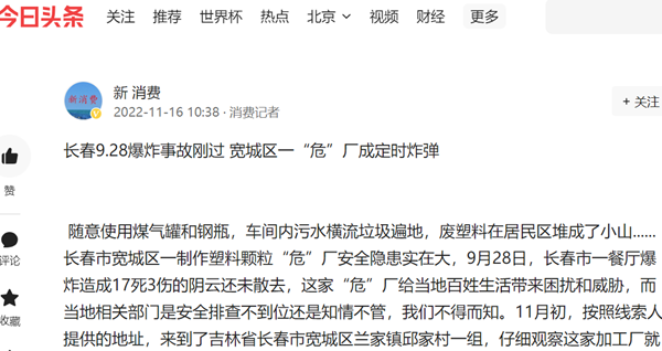 随意使用煤气罐和钢瓶,车间内污水横流垃圾遍地,废塑料在居民区堆成了小山......长春市宽城区一制作塑料颗粒“危”厂安全隐患实在大,9月28日,长春市一餐厅爆炸造成17死3伤的阴云还未散去,这家“危”厂给当地百姓生活带来困扰和威胁,而当地相关部门是安全排查不到位还是知情不管,我们不得而知。11月初,按照线索人提供的地址,来到了吉林省长春市宽城区兰家镇邱家村一组,仔细观察这家加工厂就位于村子中央,被附近村民家的房子包围,占地几百平米的院落堆满了废弃的塑料,最近的距离就紧挨着一户居民家的窗户。“味大不说,最主要是着火啦,跑都跑不出去!”一名村民说。
