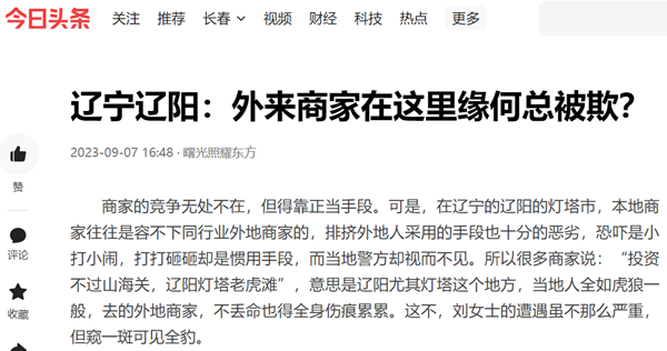 据了解,在辽宁辽阳市,尤其灯塔这个地方,外地来的商家,刘女士的遭遇只一盘小菜,更为严重屡见不鲜,当地人之所以敢如此的胆大妄为,不是他们不懂法,是有警察给他们撑腰,说白了,就是当地多年形成的环境造成的,全国都搞营商环境,辽宁的辽阳市也喊出“要当打辽沈战役来搞当地的营商环境”,可从刘女士的遭遇来看,这个地方政府的行动,恐怕只是喊个口号而已。(记者 周放)