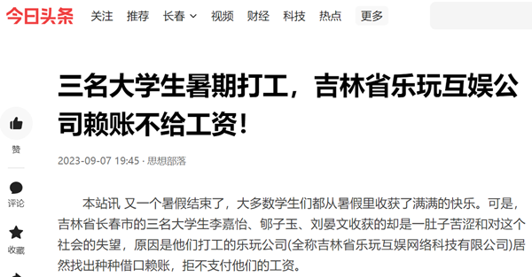 本站讯 又一个暑假结束了,大多数学生们都从暑假里收获了满满的快乐。可是,吉林省长春市的三名大学生李嘉怡、郇子玉、刘晏文收获的却是一肚子苦涩和对这个社会的失望,原因是他们打工的乐玩公司(全称吉林省乐玩互娱网络科技有限公司)居然找出种种借口赖账,拒不支付他们的工资。