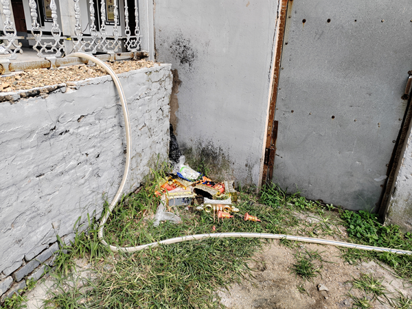 图为:殡仪服务部后身墙角堆放祭祀遗弃物品。