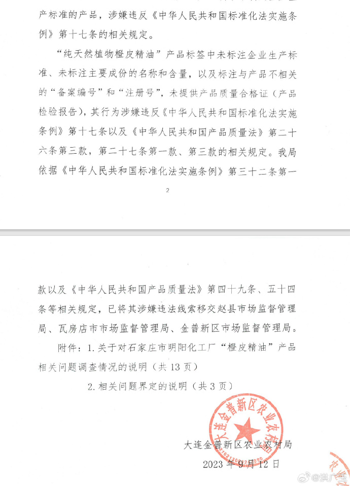 此外,于可伟所使用的“橙皮精油”产品,也是从殿龙公司购买的,该产品检出隐性添加——金州区农业农村局已经回复确认这一问题产品,但一直在踢皮球拒不处理(图7)。