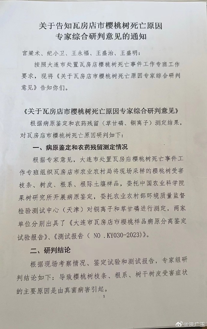 他们请了一批专家来做研判。专家研判是处理农业生产事故的正常操作,本身没啥可说的,但是,问题出在研判的专家构成和研判方向上。 这里就该轮到樱桃树行业知名活动家——北京农林科学院的张开春研究员上场了。