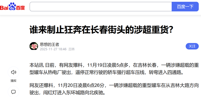 本站讯 日前,有网友爆料,11月19日凌晨5点多,在吉林长春,一辆涉嫌超载的重型罐车从热电厂驶出,逼停正常行驶的轿车强行超车压线,转弯进入四通路。 网友还爆料,11月20日凌晨...