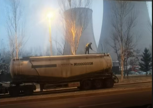 货车司机在平整装满煤灰的重型罐车 (网友提供)