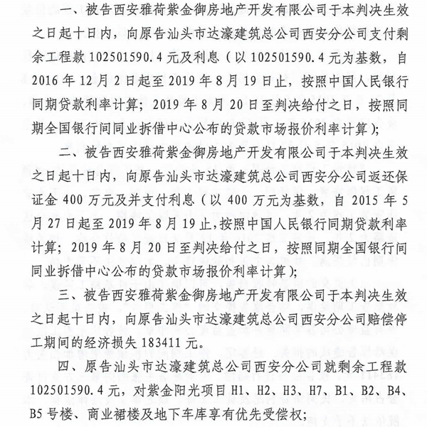 2018年5月,达濠西安分公司一纸诉状将雅荷地产起诉到西安市中级人民法院,2020年4月,该院作出(2018)陕01民初979号公正判决,支付剩余工程款102501590.4元及利息;返还保证金400万元及支付利息;赔偿停工期间的经济损失183411元;就剩余工程款102501590.4元,对紫金阳光H1、H2、H3、H7、B1、B2、B4、B5号楼、商业裙楼及地下车库享有优先受偿权……