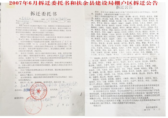 上图左图为2007年6月30日,扶余县政府委托城建局的下属单位振兴房屋拆迁公司承担此次拆迁工程;右图为扶余市建设局棚户区拆迁公告。