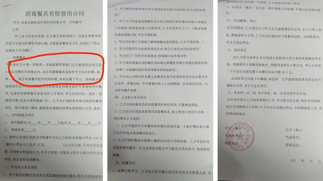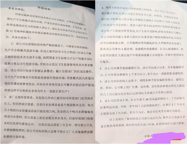 举报材料称该公司还利用主管政府部门的公信力炮制虚假合同内容。该公司为了锁定客户,签订霸王条款,打着公司是经开封市卫计委、环保局、市场监管局等部门认可批准成立的A级示范餐饮具消毒公司为借口,要求与客户签合同并签订了高额的违约赔偿金。有部分客户由于不合格餐具被消费者投诉,为了生意不受影响,想使用其他公司餐具,该公司就利用霸王条款与其打官司,要求客户赔偿高额违约金,例如开封劳动路麻婆豆腐店、大华烧烤店等均被起诉过。大华烧烤店在法庭上要求该公司拿出A级证明,见虚假内容被揭穿,该公司遂撤诉。然而,目前开封现在大部分客户还是不明真相被霸王合同套牢,不得不使用该公司餐具。我们拿到一份合同的确有该公司是经开封市卫计委、环保局、市场监管局等部门认可批准成立的A级示范餐饮具消毒公司内容,但经了解开封相关部门并未评选出具过所谓A级示范餐饮具消毒公司。