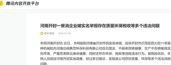 举报材料称该公司在疫情防控形势严峻的情况下,不顾老百姓的健康,生产不合格餐具流放市场,在这之前开封市卫生主管部门曾经对该公司餐具抽样检验多次全部不合格,按照国家卫生标准当天生产的餐具须经检测合格后方可投放市场,卫生执法部门多次要求整改,该公司应付检查不积极认真整改。截止目前,该厂仍在违法操作,当天生产出的餐具不经检验直接装车投放市场,导致餐具经常遭到消费者投诉,开封市许多使用该公司餐具的饭店怨声载道,质疑这样不合格的企业却为什么一直能正常生产?2023年1月5日上午八点半,本网人员在位于开封市示范区四大街11号海神机械院内河南众碗典范环保科技有限公司厂门口,看到一辆车牌豫BPS739的送货车正在从车间装运刚刚从生产线下来的餐具,准备送往开封市饭店,随后我们跟随这辆送货车来到位于开封市黄河大街与汉兴路交叉口的开封市老村寨饭店,送货员熟练的将这些餐具搬运到饭店中,我们走进饭店查看,果然生产日期是2023年元月5日,没有看到合格证书。我们了解到,按照国家卫生标准规定,当天生产的餐具须经16小时以上检测合格后方可投放市场。这就印证了该公司当天生产出的餐具是没有经检验直接装车投放到市场的违规行为。