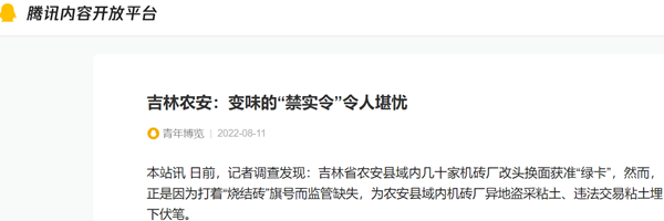 8月8日下午3时许,农安县合隆环保分局一位工作人员打来电话说:“这家砖厂不存在污染问题,该企业环评报告上标注烧结砖,主要原材料的页岩,没有粘土字样。”