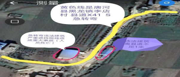 核心提示:近日有网友向本网举报唐河县黑龙镇、李店村村民“王玉成”私自在唐河X041县道李店村段急转弯处违法建房两处:严重遮挡来往车辆、及行人视线,已造成多起交通事故!根据举报线索本网第一时间进行实地走访了李店村村民、了解到自王玉成(王系黑龙镇邮政储蓄所所长职务)在公路急转弯处“建房”后发生了多起交通事故,附近石灰窑村一16岁男孩常某驾摩托到急转弯处、因违法建筑遮挡过往车辆视线造成常某车祸身亡!及其它车辆互撞等交通事故……