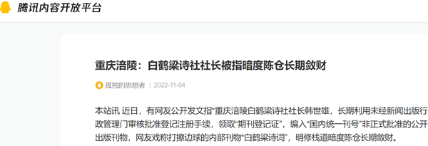 本站讯 近日,有网友公开发文指“重庆涪陵白鹤梁诗社社长韩世雄,长期利用未经新闻出版行政管理门审核批准登记注册手续,领取“期刊登记证”,编入“国内统一刊号”非正式批准的公开出版刊物,网友戏称打擦边球的内部刊物“白鹤梁诗词”,明修栈道暗度陈仓长期敛财。