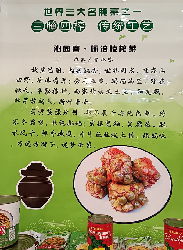 本届广交会三期正在广州举行,涪陵区两家榨菜企业参展。在重庆市涪陵绿陵实业有限公司的展区背景墙上,《沁园春·咏涪陵榨菜》以凝练优美的文字,展现出独特的地域文化魅力,吸引众多客商驻足品读。