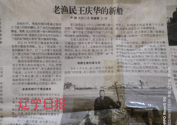 王庆华的这一做法,得到了省市两级民政部门的大力支持,同时他本人也成了当时红极一时的人物。先是《锦州日报》和《锦州晚报》用整个版面报道他及海葬的事,接着《辽宁日报》也用了很大的篇幅来报道他。顺风顺水之时,他先后投入近200万来购专业海葬船,有了政府的支持,他准备在有生之年大干一把。然而,让他没有想到的是,只因主管他的锦州市民政局社会事务处换了领导,一位叫王立新和李军的处长上任之后,老人的命运一下子改变了,到今日已到了倾家荡产的地步。