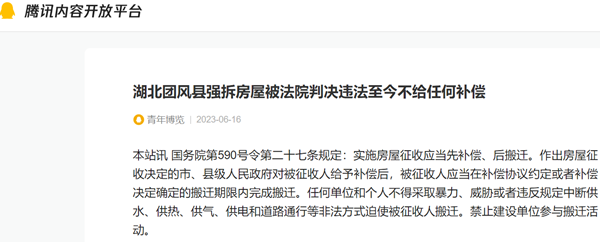 本站讯 国务院第590号令第二十七条规定:实施房屋征收应当先补偿、后搬迁。作出房屋征收决定的市、县级人民政府对被征收人给予补偿后,被征收人应当在补偿协议约定或者补偿决定确定的搬迁期限内完成搬迁。任何单位和个人不得采取暴力、威胁或者违反规定中断供水、供热、供气、供电和道路通行等非法方式迫使被征收人搬迁。禁止建设单位参与搬迁活动。