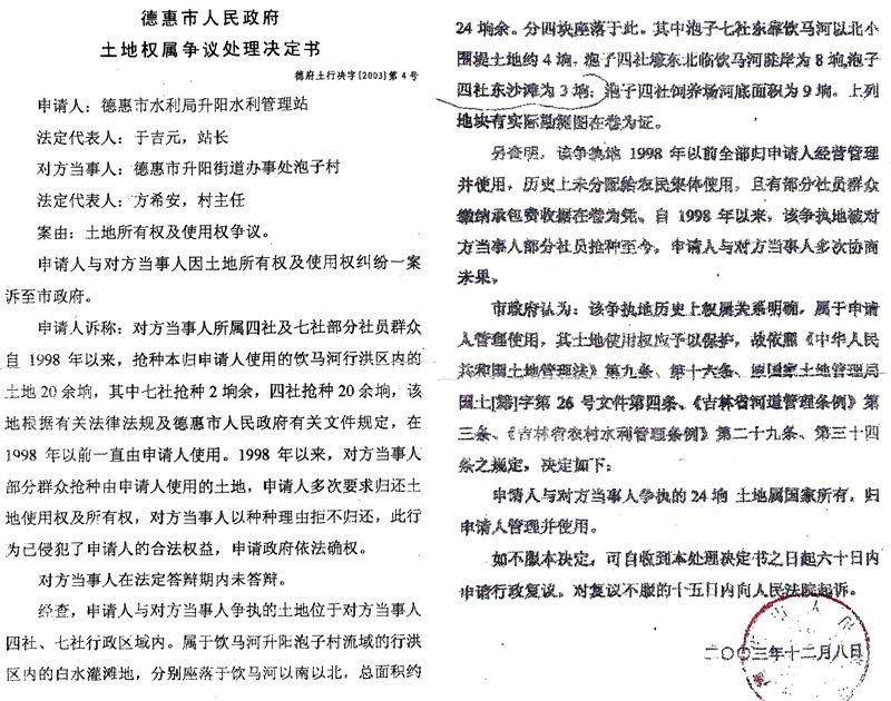 法院经审理认定事实如下:原告方向本院提供了德惠市布海镇人民政府出具的《关于鲁艳庆信访事项的情况说明》,主要内容有:按照德惠市信访联席会议办公室要求,我镇对鲁艳庆信访事项进行调查处理,信访人反映的主要问题是自己承包的土地被董玉财毁地、抢收,其中,2021年春天耕种1.3垧黄豆被董玉财毁坏,2021年秋天1.3垧黄豆被董玉财抢收,2022年秋天2.3垧黄豆被董玉财抢收,要求董玉财赔偿损失;自己继续承包该处土地。调查处理情况:1、因饮马河河道取直,将部分原在饮马河西侧土地调整到饮马河东侧,但该部分土地为更改管理地,一直由德惠市水利局升阳水利管理站管理使用;2、2020.年按照吉林省1号河长令、长春市1号河长令要求,我布海镇政府和大青咀镇政府开展退耕还林工作,对河道非在册土地进行清查清收,清收时以饮马河为界,大青咀政府清理饮马河以东河道地。清收后大青咀政府将河东土地统一发包种草种树,该两处土地由大青咀政府发包给董玉财,其中包括升阳水利管理站包给鲁艳庆的两处土地。董玉财承包河道土地后,仍然种植黄豆,并未种草、种树;3、董玉财毁坏、抢收鲁艳庆的土地为我镇泡子村4社壕东临饮马河陡岸和泡子4社东沙滩士地,此两处士地于2003年12月8日经德惠市人民政府以德府土行决宇(2003)第4号上地权属争议处理决定书确权给德惠市水利局升阳水利管理站管理供用。其中,泡子村4社壕东临饮马河陡岸共8垧,泡子4社东沙滩土地共3垧;2005年2月8日,德惠市水利局升阳水利管理站承包给我镇泡子村前霍家屯4社鲁艳庆(承包日期:从2005年2月8日至2024年12月30日为止,有合同、补充协议及缴款凭证为依据)......处理意见:1.鲁艳庆所反映的土地(2021年春天东南滩耕种1.3垧黄豆被董玉财毁坏,2021年秋天东沙滩1.2垧黄豆被董玉财抢收,2022年秋天东南滩2.3垧黄豆被董玉财抢收。该处土地一直归属升阳水利管理站使用,自2005年2月8日起承包给鲁艳庆耕种,至今还处于承包期内,该处土地耕种权应归鲁艳庆所有;2、董玉财应赔偿2021年、2022年两年毁地、抢收对鲁艳庆造成的损失;3、此后继续由鲁艳庆承包泡子村4社壕东临饮马河陡岸4垧土地和泡子4社东沙滩土地1垧土地直至合同期结束.....