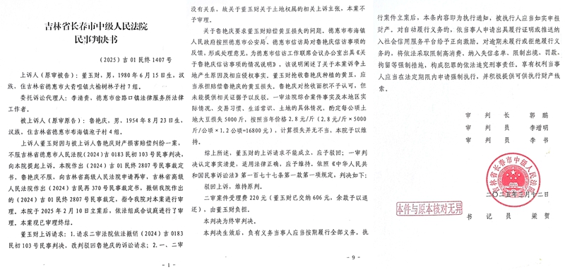一审判决作出后,董玉财不服提起上诉。据长春市中级法院 (2025)吉01民终1407号民事判决书记载:董玉财因与被上诉人鲁艳庆财产损害赔偿纠纷一案,不服德惠市法院(2024)吉0183民初103号民事判决,向本院提起上诉。本院作出(2024)吉01民终2807号民事裁定书,鲁艳庆不服,向吉林省高级法院申请再审,吉林省高级法院作出(2024)吉民再370号民事裁定书,撤销我院作出的(2024)吉01民终2807号民事裁定,指令我院对本案进行审理。本院于2025年2月10日立案后,依法组成合议庭进行了审理。但是,长春市中级法院终审判决,驳回上诉,维持原判。
