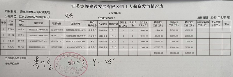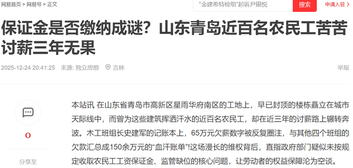本站讯 在山东省青岛市高新区星雨华府南区的工地上,早已封顶的楼栋矗立在城市天际线中,而曾为这些建筑挥洒汗水的近百名农民工,却在近三年的讨薪路上辗转奔波。木工班组长史建军的记账本上,65万元欠薪数字被反复圈注,与其他四个班组的欠款汇总成150余万元的“血汗账单”!这场漫长的维权背后,直指政府部门疑似未按规定收取农民工工资保证金、监管缺位的核心问题,让劳动者的权益保障沦为空谈。