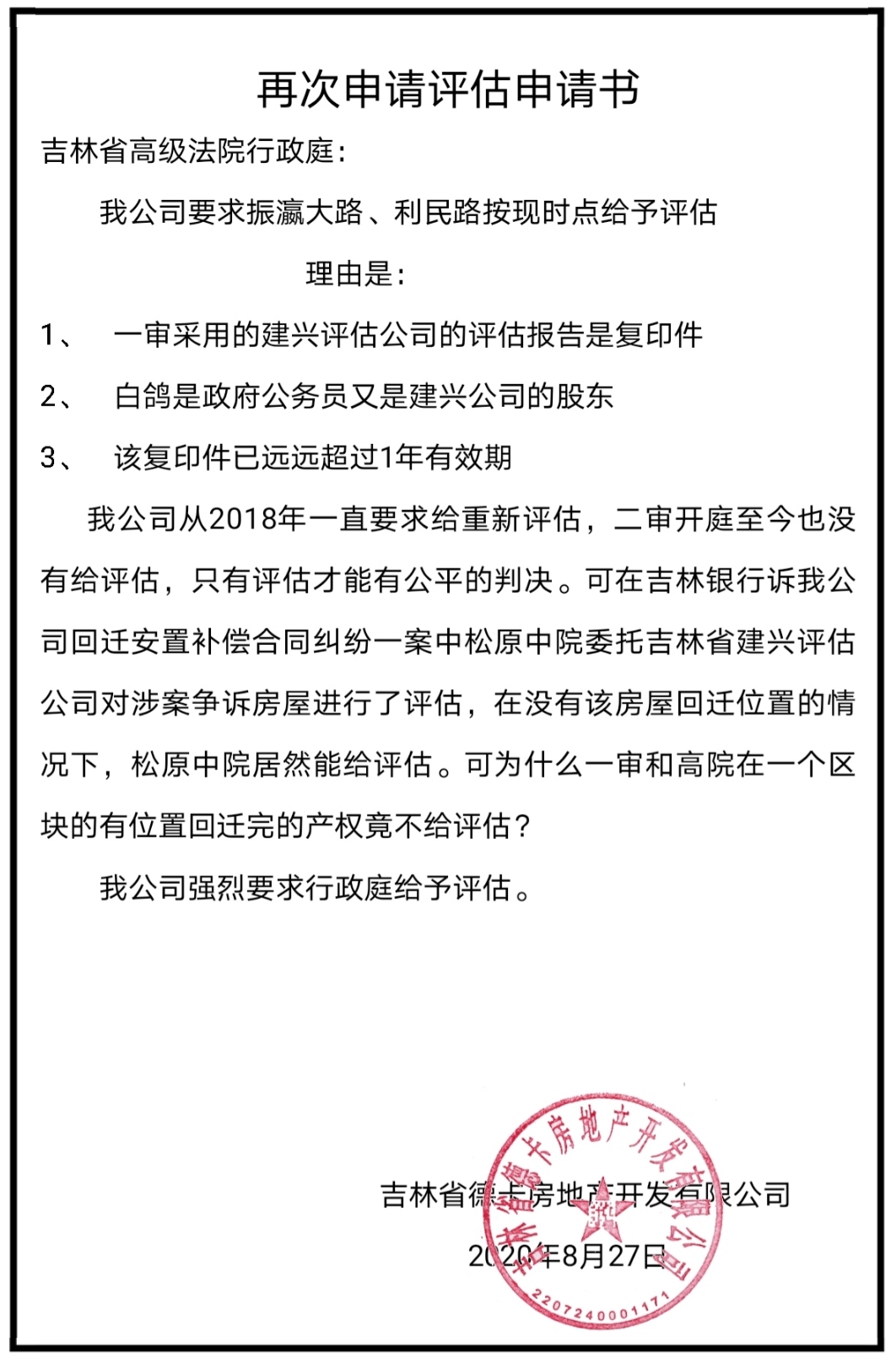 德卡公司致信吉林省高级人民法院院长徐家新恳请其主持公道